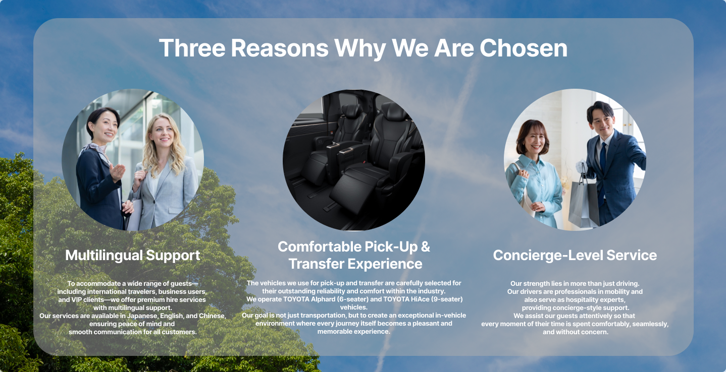 Our professional drivers speak Japanese, English, and Chinese,
